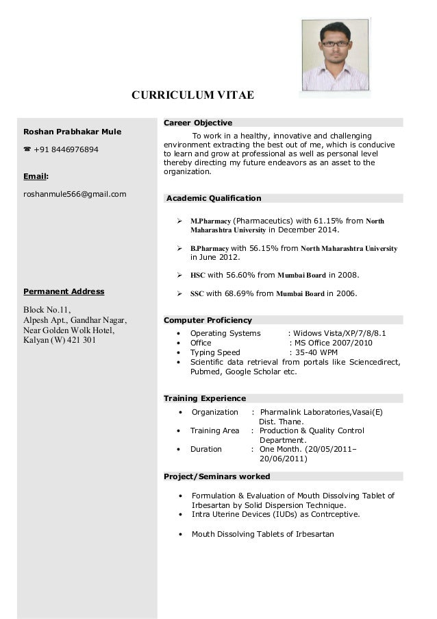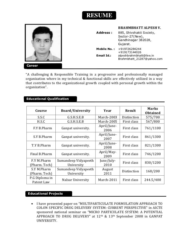 B.Pharmacy Fresher Resume Models - 2015-2016 StudyChaCha