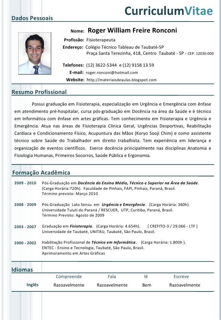 Modelo de Curriculum Fisioterapeuta | Exemplo de CV Terapeuta ...